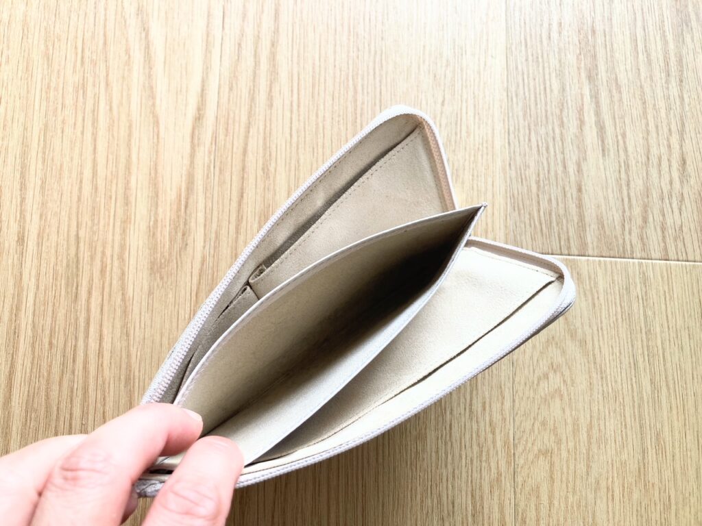 L字ファスナーを開けるだけですぐ小銭を出し入れすることができるうえ、お札もカードも全体を見渡せることができます。