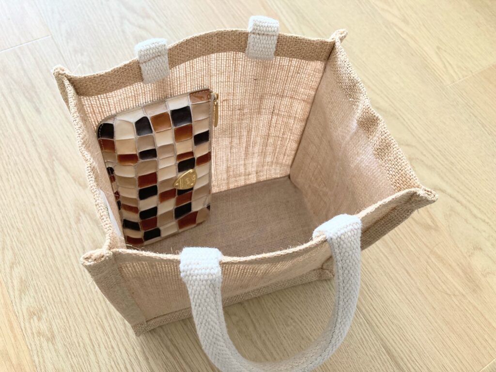 私は無印のジュートマイバッグのA6サイズを愛用しているのですが、ちょうど治まりよく、出し入れもしやすくて気に入っています。